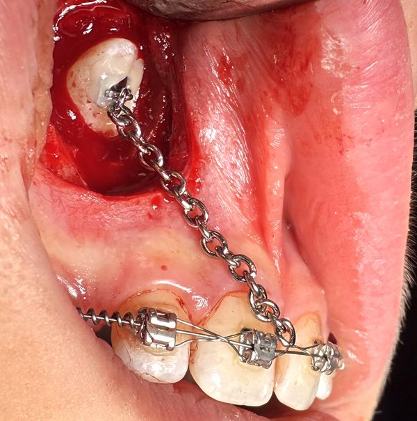 Eine Zahnfreilegung ist eine (manchmal sehr kleine) Operation die dann durchgeführt wird, wenn ein oder mehrere Zähne an einem natürlichen Zahndurchbruch verhindert werden, somit bleibende Zähne nicht von allein an ihren regulären Platz in der Zahnreihe gelangen. Es handelt sich in der Regel um einen gesunden, eigenen Zahn der noch im Kieferknochen versteckt ist. Bei dieser OP wird der Zahn durch uns freigelegt und mit einem kleinen Metallplättchen (Bracket/Zugkette) beklebt und später durch die/den Kieferorthopäden/-in zum Einwandern in die Zahnreihe gebracht.