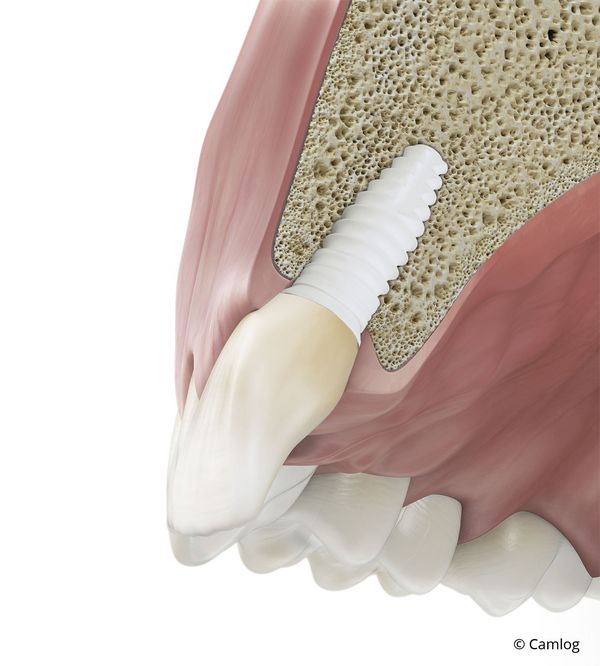 Zur Einbringung solcher Zahnimplantate ist meist nur ein kleiner ambulanter Eingriff in Lokalanästhesie nötig. Bei ausreichendem Knochenangebot ist die Verankerung ohne vorbereitende Maßnahmen möglich.